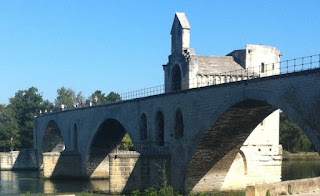 Je découvre le pont d’Avignon, et qu’il commence par un pont levis, et qu’il ne reste plus que 4 arches sur 22. En effet, il faisait un coude et traversait l’île de Barthelasse. Il a été construit par Bénézet (petit Benoît), qui a été canonisé pour l’occasion. Voilà qui devrait faire rêver nos bâtisseurs modernes. Jadis ce fut un pont stratégique pour l’économie régionale, en dépit de son étroitesse. Il n’y avait que lui qui traversait le Rhône.